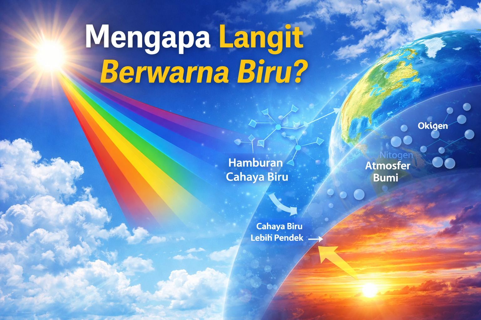 Fenomena yang menyebabkan langit tampak biru disebut Hamburan Rayleigh. Proses ini terjadi ketika cahaya matahari bertabrakan dengan molekul kecil di atmosfer, seperti nitrogen dan oksigen.